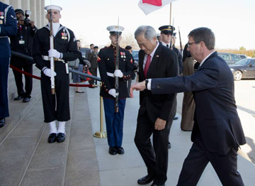 Trong Tuyên bố chung, Bộ trưởng Quốc phòng Mỹ Ash Carter và Bộ trưởng Quốc phòng Singapore Ng Eng Hen hoan nghênh việc triển khai khai máy bay Mỹ đến Singapore, từ ngày 7-14/12.