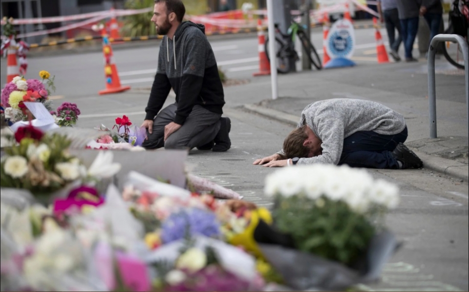 | Người dân cầu nguyện cho những người thiệt mạng bên ngoài đền thờ Linwood ở thành phố Christchurch, New Zealand. (Nguồn: AP) |