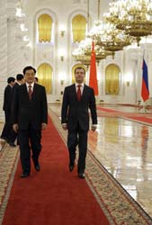 | Tổng thống Nga Medvedev (phải) đón Chủ tịch Chủ tịch Trung Quốc Hồ Cẩm Đào. |