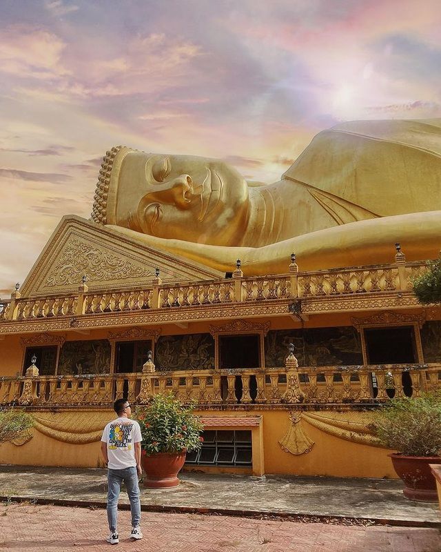 | Đặc biệt, đến chùa Vàm Ray, du khách còn có cơ hội chiêm ngưỡng bức tượng Phật Thích Ca nhập Niết Bàn có kích thước lớn, được sơn thếp vàng nổi bật. Theo trang Trung tâm Thông tin xúc tiến du lịch Trà Vinh, tượng dài 5m, cao 20m, ngang 16m. (Ảnh: @Dupeo.review) |