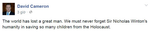 Trước sự ra đi của ông Nicholas, Thủ tướng Anh David Cameron đã chia sẻ trên trang mạng xã hội của mình: "Thế giới đã mất đi một vĩ nhân. Chúng ta sẽ không bao giờ quên lòng nhân ái của ngài Nicholas Winton khi cứu sống biết bao trẻ em khỏi nạn diệt chủng".
