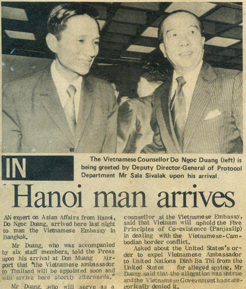 “Một chuyên gia về châu Á từ Hà Nội, ông Đỗ Ngọc Dương, đến đây tối qua để đứng đầu Đại sứ quán Việt Nam tại Bangkok. Ông Dương đi cùng với sáu nhân viên của mình, chia sẻ với báo chí về chuyến đi tới Thái Lan của mình, tại sân bay Don Muang, rằng: "Đại sứ Việt Nam tại Thái Lan sẽ sớm được bổ nhiệm và sẽ đến đây không lâu sau đó". Ông Dương, người sẽ đảm nhận vai trò Đại biện tại Đại sứ quán Việt Nam nói rằng, Việt Nam sẽ tôn trọng năm nguyên tắc cùng chung sống đồng thuận trong xử lý xung đột biên giới giữa Việt Nam và Campuchia...” (Trích từ tin trên báo chí Thái Lan về sự kiện ông Đỗ Ngọc Dương đến Bangkok) |