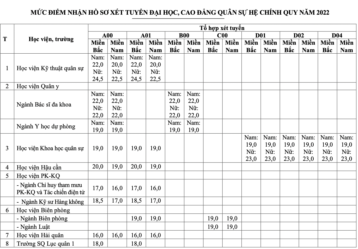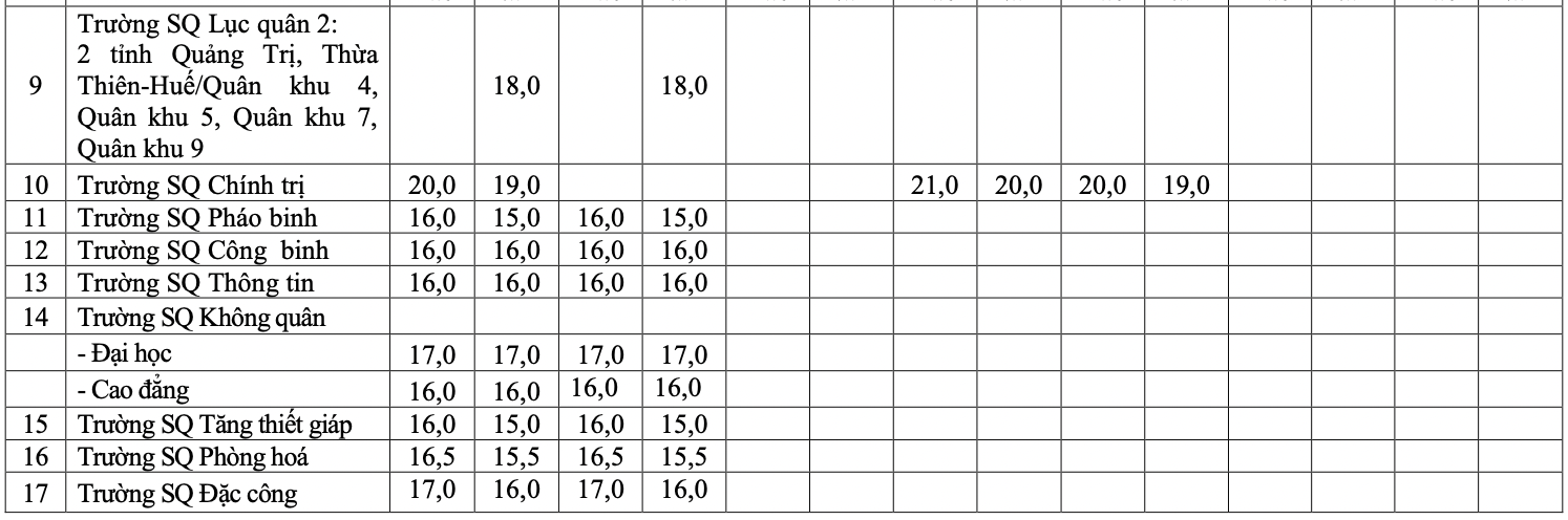 Cụ thể, điểm sàn các trường quân đội như sau:
