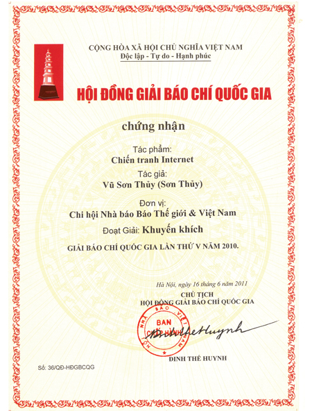 Tính dự báo là một đặc tính cực kỳ quan trọng để tạo nên thành công của một tác phẩm báo chí hiện đại. Tác phẩm "Chiến tranh internet" của nhà báo, nhà ngoại giao Vũ Sơn Thủy là một trong những tác phẩm như vậy. Được xuất bản lần đầu trên tờ Thế Giới & Việt Nam cách đây nửa năm 29/12/2010, nhưng bài báo này vẫn cho thấy sức "nóng" khi giờ đây, chúng ta đang phải thực sự đối mặt với một cuộc chiến trên internet như tác giả đã đề cập và ở cấp độ toàn cầu. Nhân kỷ niệm Ngày Báo chí Cách mạng Việt Nam và Tác phẩm này được trao Giải Khuyến khích Giải Báo chí Quốc gia 2011, TG&VN xin trân trọng giới thiệu lại tác phẩm này và xin chúc mừng nhà báo Sơn Thủy. |