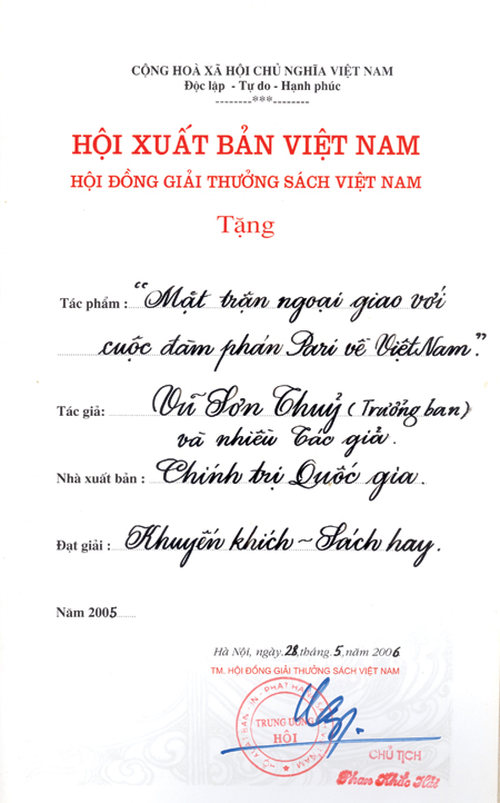 | Tổng Biên tập báo Thế Giới & Việt Nam Vũ Sơn Thủy là nhà báo ngoại giao đầu tiên giành Giải Báo chí Quốc gia. |