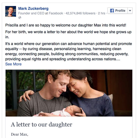 Ngay sau đó, trên trang facebook cá nhân, Zuckerberg đã viết một lá thư cho con gái Max của mình và tuyên bố hiến tặng 99% tài sản (khoảng 45 tỷ USD) cho dự án thiện nguyện Sáng kiến Zuckerberg Chan với mục đích “làm cho thế giới trở nên tốt đẹp hơn và Max trưởng thành trong thế giới đó”.