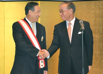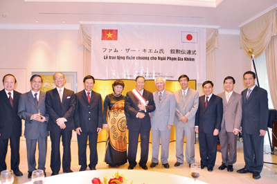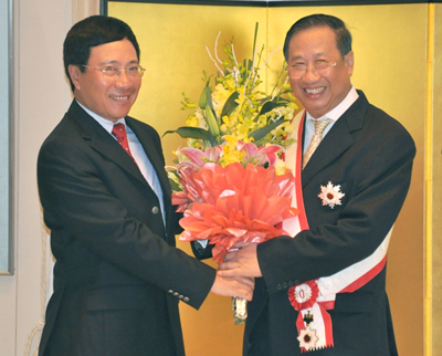 | Đại sứ Nhật Bản tại VN Yasuaki Tanizaki trao tặng Huân chương Mặt trời mọc hạng Nhất cho nguyên Phó Thủ tướng, Bộ trưởng Ngoại giao Phạm Gia Khiêm. |