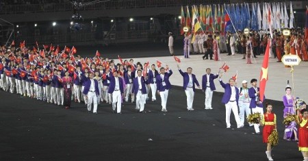 Đoàn thể thao Việt Nam đi gần cuối trong lễ diễu hành (chỉ trước nước chủ nhà Myanmar). VĐV bơi lội Hoàng Quý Phước đã vinh dự cầm cờ cho Đoàn thể thao Việt Nam trong lễ khai mạc. Quý Phước là một trong những VĐV bơi lội xuất sắc nhất của Việt Nam, đại diện cho lớp trẻ đang ngày càng nỗ lực vươn lên sánh ngang với bạn bè thế giới.