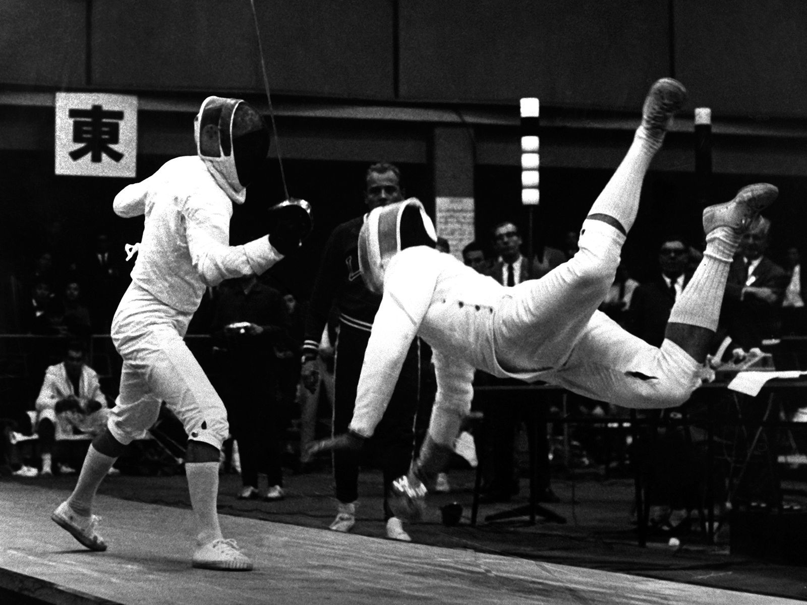 | Vận động viên đấu kiếm người Đức Walter Kostner 'bay trên không' trong trận đấu với Jerzy Pawlowski người Ba Lan. (Nguồn: AP) |