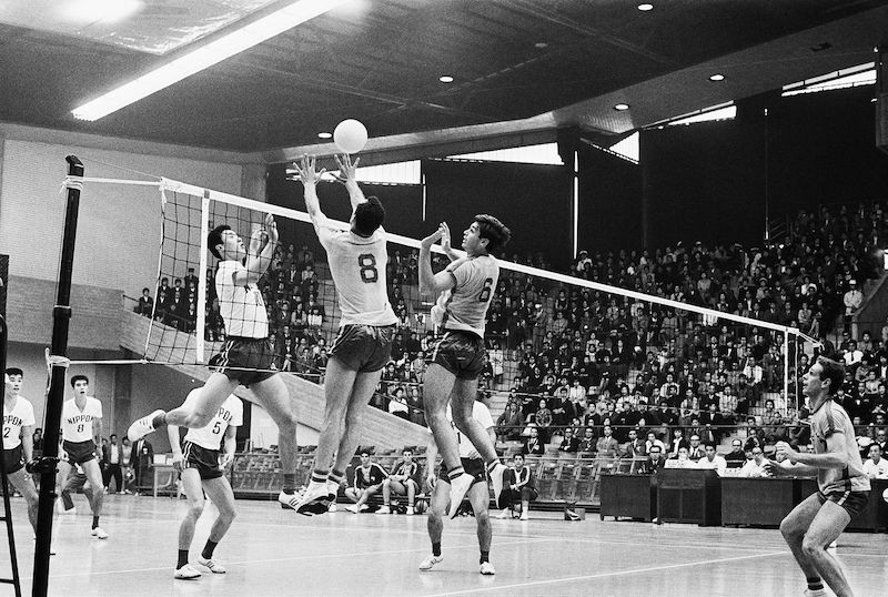 | Olympic Tokyo năm 1964 là lần đầu tiên xuất hiện các nội dung thi đấu mới, gồm judo nam và bóng chuyền. Trong ảnh là vận động viên bóng chuyền Brazil Ramalho Oliveira (áo số 8) chặn một cú đánh của đối thủ người Nhật Bản Terushia Moriyama. (Nguồn: Getty Images) |