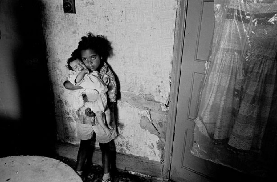 | Một bé gái bế em trong căn nhà ẩm ướt tại Balsall Heath năm 1970. |