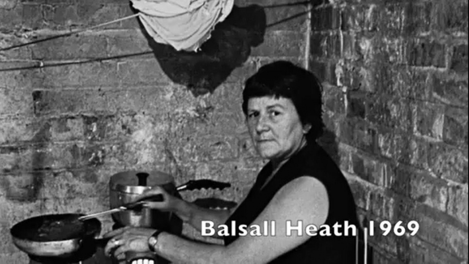 | Một bà mẹ nấu ăn trong căn bếp tồi tàn ở Balsall Heath năm 1969. |