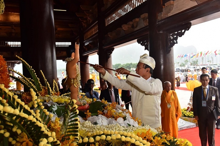 | Tổng thống Myanmar Win Myint thực hiện nghi lễ tắm Phật. |
