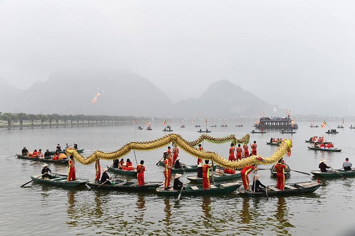 | Thuyền rồng được biểu diễn tại hồ Tam Chúc. |