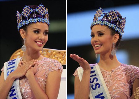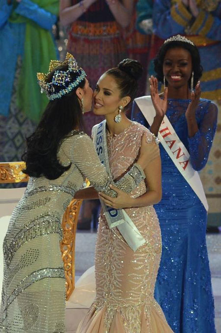 Cô nhận sự chúc mừng và vương miện từ Miss World 2012 người Trung Quốc Vu Văn Hà.