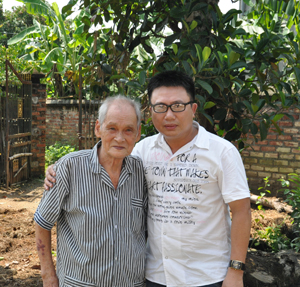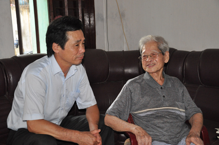| Cụ Hoàng Tuấn Sơn trò chuyện với Giám đốc sở Ngoại vụ Cao Bằng Lê Bá Vũ. |