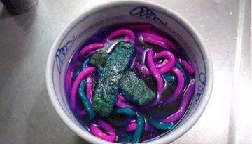 Bên cạnh nền văn hóa ẩm thực cổ truyền vô cùng tinh tế, người dân Nhật Bản vẫn thường khiến các thực khách phải khóc thét vì những món ăn có một không hai mà họ nghĩ ra. Hồi cuối tuần trước, nhà phê bình ẩm thực Kurare Raku đã đăng tải lên trang Twitter của mình bức ảnh một bát mỳ Udon. Các sợi mỳ có màu hồng, tím với nước dùng và đậu phụ rán màu xanh lam. Đặc biệt, món ăn này có thể phát sáng như đèn neon trong bóng tối.