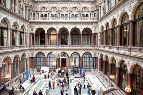 Các văn phòng, phòng họp và nội thất của tòa nhà ấn tượng về quy mô và sự lộng lẫy, đặc trưng của trường phái kiến trúc được gọi là "phong cách Stalin". Các bức tường trong đại sảnh lát đá cẩm thạch màu sáng, sàn lát đá granite màu đen, cột đá cẩm thạch nhân tạo cùng cửa sổ kính màu.