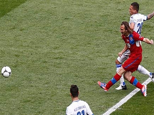 Phút 40, Hy Lạp đã làm tung lưới Séc với một pha đánh đầu cận thành của Fotakis, tuy nhiên bàn thắng đã không được công nhận vì lỗi việt vị. Hiệp một khép lại với tỷ số 2-0 nghiêng về Cộng hòa Séc.