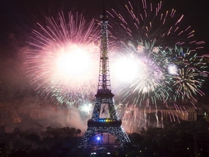 | Pháo hoa được bắn lên bầu trời quanh tháp Eiffel ở thủ đô Paris, mừng ngày Quốc khánh Pháp. (Nguồn: AFP/TTXVN) |