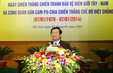 Thay mặt lãnh đạo Đảng, Nhà nước, tôi nhiệt liệt chào mừng các đồng chí Lãnh đạo, nguyên Lãnh đạo Đảng, Nhà nước, Mặt trận Tổ quốc Việt Nam, đại diện các cơ quan Trung ương và địa phương, đại diện các gia đình thương binh, liệt sỹ, các đồng chí cựu chuyên gia, cựu Quân tình nguyện Việt Nam đã tới dự Lễ Mít tinh trọng thể kỷ niệm 35 năm Ngày Chiến thắng chiến tranh bảo vệ biên giới Tây-Nam, góp phần cùng quân và dân Campuchia Chiến thắng chế độ diệt chủng (07/01/1979 – 07/01/2014).