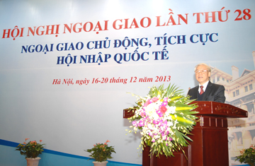 So với Hội nghị Ngoại giao lần thứ 27 hai năm trước, Hội nghị lần này của chúng ta diễn ra trong bối cảnh tình hình thế giới, khu vực và trong nước có nhiều diễn biến mới. Toàn Đảng, toàn dân ta đang đứng trước những nhiệm vụ nặng nề của sự nghiệp xây dựng và bảo vệ Tổ quốc. Công tác đối ngoại, với tư cách là một mặt trận quan trọng, cũng đang đứng trước rất nhiều thách thức. Nếu như Hội nghị lần thứ 27 có nhiệm vụ quán triệt quan điểm, chủ trương, đường lối của Đại hội XI để xây dựng chương trình hành động cụ thể trên lĩnh vực đối ngoại thì Hội nghị lần này là dịp để kiểm điểm, đánh giá hai năm triển khai thực hiện vừa qua, cũng là hơn nửa nhiệm kỳ thực hiện Nghị quyết Đại hội XI, đồng thời đề xuất các nhiệm vụ đối ngoại trọng tâm cho những năm tới, nhằm tiếp tục thực hiện Nghị quyết Đại hội XI. Đây cũng là dịp để chúng ta khởi động việc trao đổi, gợi mở nghiên cứu một số vấn đề lớn, vấn đề mới về đối ngoại, chuẩn bị cho Đại hội Đại biểu toàn quốc lần thứ XII của Đảng. Tôi tin tưởng và mong rằng các đồng chí sẽ phát huy cao độ trí tuệ, làm việc một cách nghiêm túc, trách nhiệm và sáng tạo để tìm ra các giải pháp, đối sách phù hợp cho các vấn đề đối ngoại hiện nay của chúng ta.