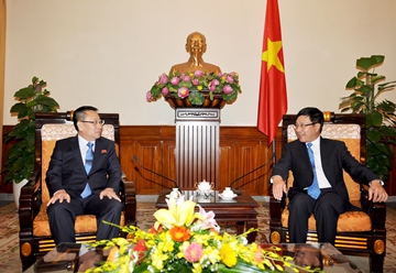 | Phó Thủ tướng, Bộ trưởng Bộ Ngoại giao Phạm Bình Minh tiếp Đại sứ Triều Tiên Kim Myong Gil. Ảnh: Quang Hòa/TGVN |