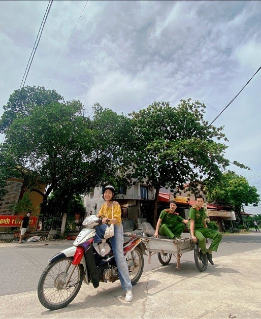 | Trần Vân cùng Đức Hiếu và Anh Tuấn trong một bức ảnh hậu trường hài hước sau khi Hoài mang xe chở giường tới cho Nam trưởng công an xã. |