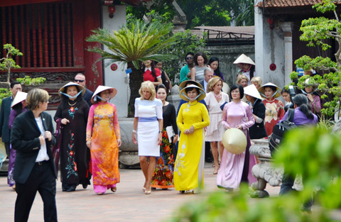 | Bà Jill Biden (áo trắng) cùng bà Mai Thị Hạnh (áo vàng) tham quan Văn Miếu – Quốc Tử Giám. (Ảnh: Quang Chinh) |
