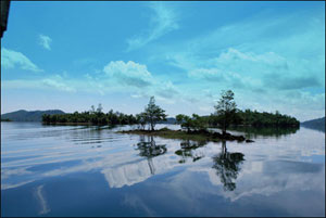 Bao quanh lòng hồ là những núi non, phi lao, bạch đàn, thông caribê tươi tốt in bóng lung linh xuống mặt hồ. Cảnh quan thiên nhiên đặc sắc, không khí trong lành, non nước hữu tình giúp bạn quên đi bao căng thẳng, mệt mỏi và phiền muộn đời thường. Thấp thoáng trên những hòn đảo rợp bóng cây là những nhà nghỉ đẹp, hài hòa cùng cảnh trí thiên nhiên, với các loài chim lạ. Những chiếc du thuyền nhẹ lướt trên mặt hồ tĩnh lặng, đưa du khách đi thăm cảnh hồ, đảo, điểm nước khoáng nóng... Bạn có thể vừa đi dạo trên thuyền vừa nhìn ngắm đàn khỉ chuyền cành hay nghe chim hót trong những khu rừng cổ thụ.