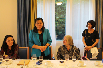 | Chủ tịch HLHPNVN Nguyễn Thị Thanh Hòa phát biểu cảm ơn những người bạn Thụy Sĩ. (Bà J. Weil, Chủ tịch Hội Hữu nghị Thụy sĩ- Việt Nam thứ 2 từ phải) |