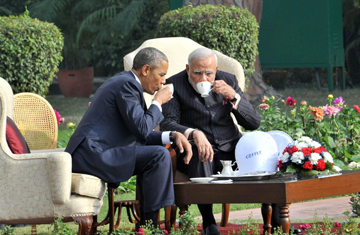 | Thủ tướng Modi cùng Tổng thống Obama uống cà phê tại khu vườn thuộc Hyderabad House, New Delhi, ngày 25/1. (Ảnh: EPA/PRESS INFORMATION BUREAU) |