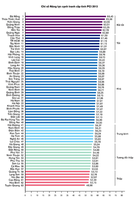 Đứng đầu bảng xếp hạng năm 2013 là thành phố Đà Nẵng, từ vị trí thứ 12 của năm 2012 vươn lên dẫn đầu với 66,45 điểm. Tiếp theo là Thừa Thiên - Huế xếp thứ 2 với 65,56 điểm; Kiên Giang xếp thứ 3 với 63,55 điểm; Quảng Ninh lần đầu tiên đứng trong tốp 4 với 63,51 điểm.