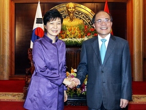 Vui mừng được gặp lại Chủ tịch Quốc hội Nguyễn Sinh Hùng tại Việt Nam sau thành công từ chuyến thăm của Đoàn đại biểu Cấp cao Quốc hội Việt Nam tới Hàn Quốc, Tổng thống Park Geun Hye cho biết Chính phủ và nhân dân hai nước đang không ngừng nỗ lực đưa quan hệ hợp tác lên tầm cao mới, thiết thực và hiệu quả hơn.