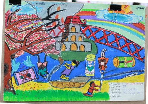 Em Hoàng Minh Thùy (giải Ba) chia sẻ về tác phẩm của mình: Với tình yêu hòa bình và sự chung tay góp sức cùng bạn bè thế giới, thế hệ trẻ đang khâu lại những vết thương chiến tranh để tạo ra một hình ảnh Hà Nội hiện đại, thanh bình và tươi đẹp.