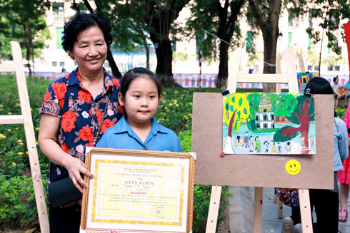 Các em nhỏ và gia đình tranh thủ ghi lại khoảnh khắc đáng nhớ với bức tranh đoạt giải. Tác phẩm của các họa sĩ nhí này sẽ được trưng bày tại một cuộc triển lãm diễn ra sau đây ít ngày.