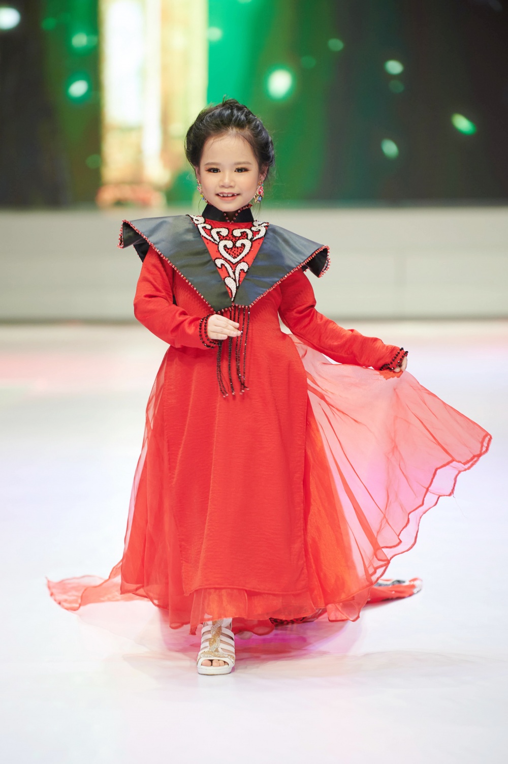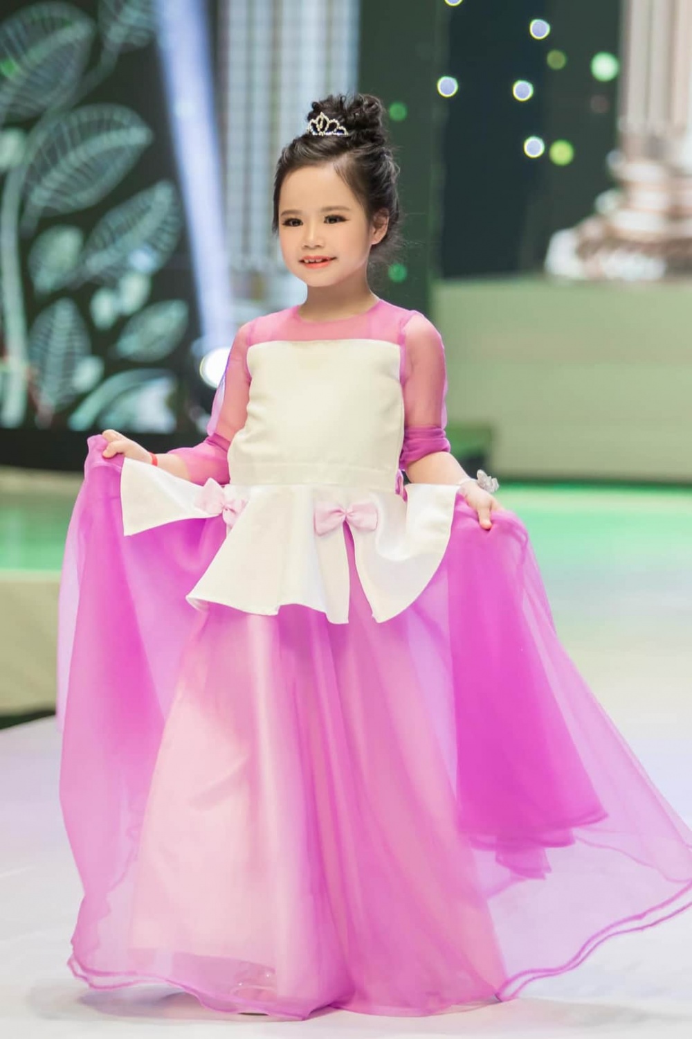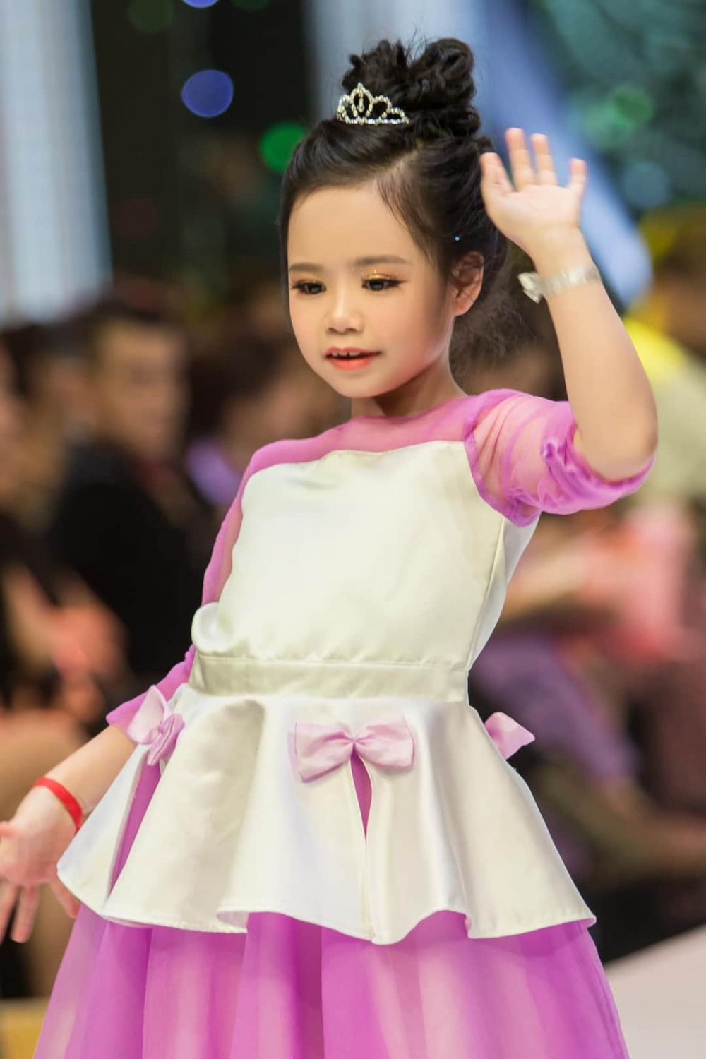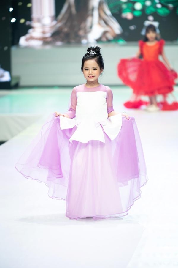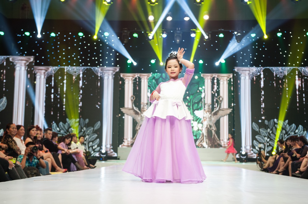 Siêu mẫu nhí Hoàng Vân đầy tự tin sải bước như một “Nàng thơ”, vừa rực rỡ, vừa trong trẻo như một thiên thần bay bổng giữa không gian cổ tích thật ấn tượng, thần thái, cùng với sự chuyên nghiệp trên sàn Catwalk.