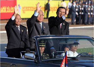 | Từ phải sang: Thủ tướng Campuchia Hun Sen, Chủ tịch đảng CPP Chea Sim và Chủ tịch Quốc hội Heng Samrin tại Lễ kỷ niệm ở Phnom Penh. |
