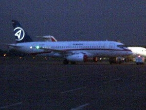 | Chiếc "Sukhoi 100" trên đường băng ở Jakarta đêm 8/5 trước khi cất cánh tiến hành chuyến bay trình diễn. (Nguồn: AFP/TTXVN) |