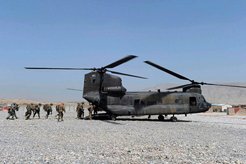 Lính Mỹ đổ bộ từ một chiếc trực thăng quân sự Chinook ở tỉnh Laghman, Afghanistan, ngày 19/7/2011.