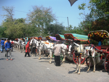 | Đoàn xe ngựa đưa đón khách vào Taj Mahal. (Ảnh: Minh Hòa). |