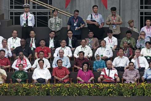 | Các nhà lãnh đạo nước ngoài dự lễ Diễu binh mừng ngày Quốc khánh ở Singapore. |