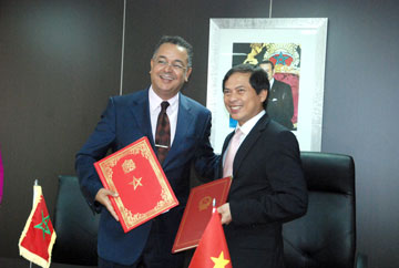| Bộ trưởng Công Thương Morocco và Thứ trưởng Ngoại giao Việt Nam Bùi Thanh Sơn trao đổi văn kiện hiệp định hợp tác hai nước. (Nguồn: Bộ Ngoại giao) |