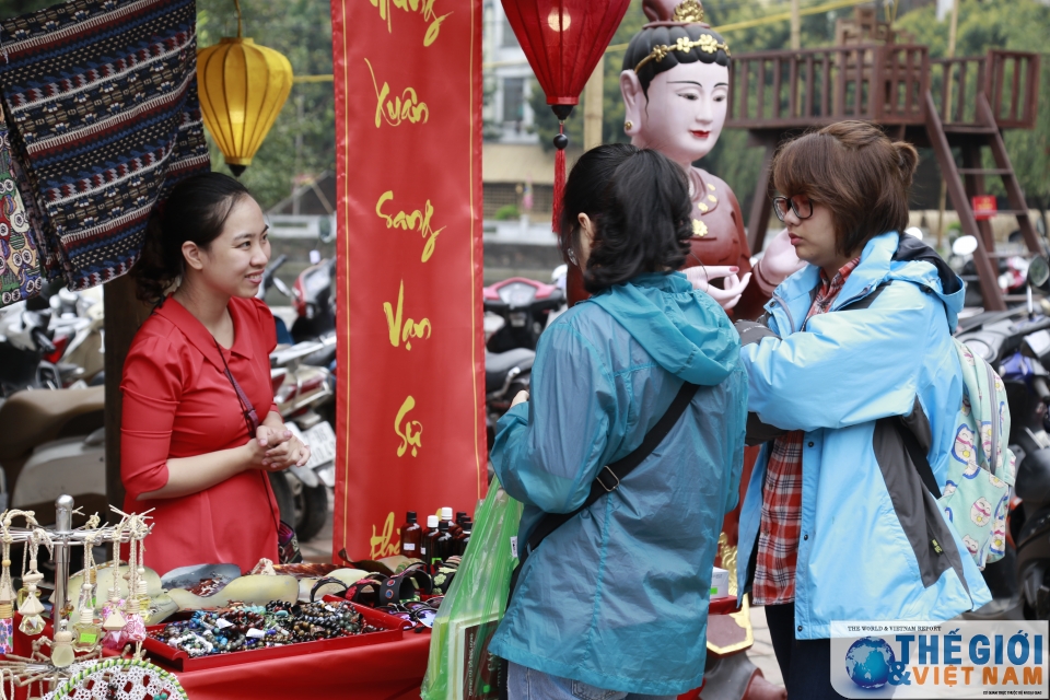 | Ngoài sách, khách tham quan còn ghé chọn mua những món đồ lưu niệm đặc trưng của Khu di tích lịch sử Văn Miếu - Quốc Tử Giám. (Ảnh: Trung Hiếu) |