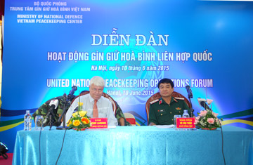 | Phó Tổng Thư ký LHQ Hervé Ladsous và Trung tướng Võ Văn Tuấn, Phó Tổng tham mưu trưởng Quân đội nhân dân Việt Nam chủ trì Diễn đàn chiều 10/6. |