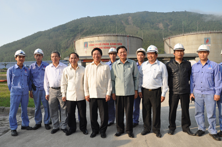 | Bộ trưởng Ngoại giao Phạm Bình Minh và Phó Thủ tướng, Bộ trưởng Ngoại giao Lào thăm và chụp ảnh lưu niệm với cán bộ, công nhân công ty cổ phần dầu khí, xăng dầu Vũng Áng. |