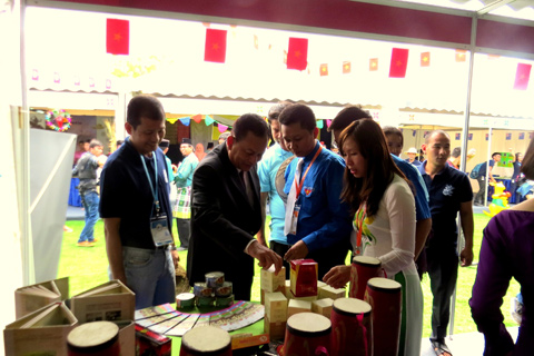 | Thứ trưởng phụ trách các vấn đề về thanh niên - Bộ Giáo dục, Thể thao và Thanh niên Campuchia Touch Choeun đang tìm hiểu các sản phẩm hạt điều tại gian hàng của đoàn Việt Nam. |
