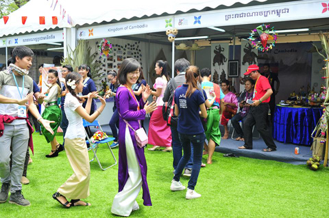 | Đoàn đại biểu Việt Nam giao lưu điệu múa truyền thống với các bạn Campuchia. |