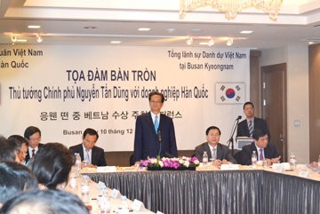 Trao đổi với các doanh nghiệp, Thủ tướng Nguyễn Tấn Dũng đánh giá hợp tác kinh tế giữa Việt Nam và Hàn Quốc đang phát triển nhanh. Hàn Quốc hiện là nước đầu tư lớn nhất tại Việt Nam với tổng số vốn FDI đăng ký khoảng 37 tỷ USD, đồng thời là đối tác thương mại lớn thứ ba và đối tác cung cấp ODA song phương lớn thứ hai cho Việt Nam. Thủ tướng nhấn mạnh ý nghĩa của việc hai nước ký kết Tuyên bố cơ bản kết thúc đàm phán Hiệp định thương mại tự do (FTA) Việt Nam - Hàn Quốc, tạo cơ hội lớn để thúc đẩy và làm sâu sắc hơn nữa hợp tác kinh tế - thương mại - đầu tư song phương. Thủ tướng khẳng định Chính phủ Việt Nam hoan nghênh và tạo mọi điều kiện thuận lợi cho các doanh nghiệp Hàn Quốc nói chung và tại Busan nói riêng kinh doanh, đầu tư tại Việt Nam.