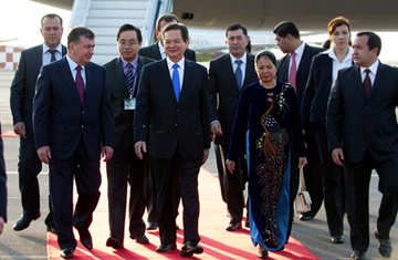 Thủ tướng Shavkat Mirziyoyev cùng các quan chức cấp cao của Uzbekistan đã ra tận thang máy bay đón Thủ tướng Nguyễn Tấn Dũng và Phu nhân.